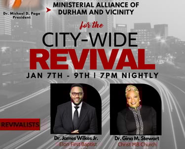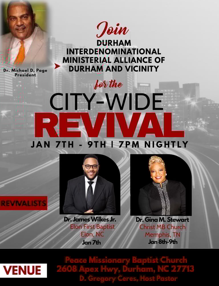 Join the Durham IMA city-wide revival at Peace Missionary Baptist Church at 7:00 pm, January 7th - 9th.